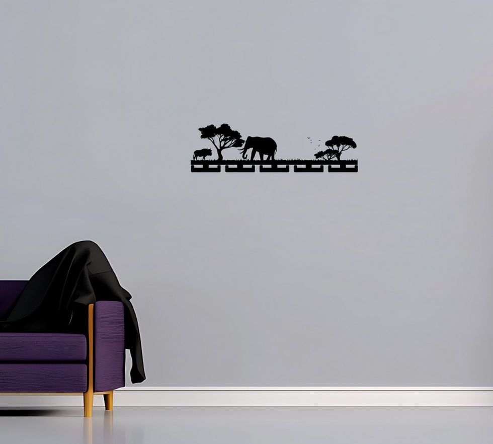 Step into the peaceful rhythm of the wild with this safari-themed metal wall hook, showcasing a graceful giraffe, a majestic elephant, and iconic savanna trees in perfect silhouette.